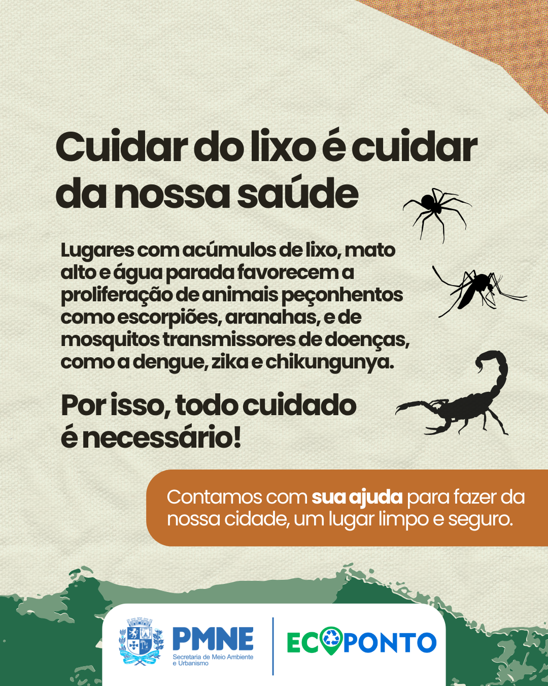 O acúmulo de lixo, entulhos e objetos em terrenos baldios ou vias públicas favorece a proliferação de animais peçonhentos, como escorpiões e aranhas, além de mosquitos transmissores de doenças como dengue, zika e chikungunya. Cuidar do lixo é cuidar da saúde de toda a comunidade.