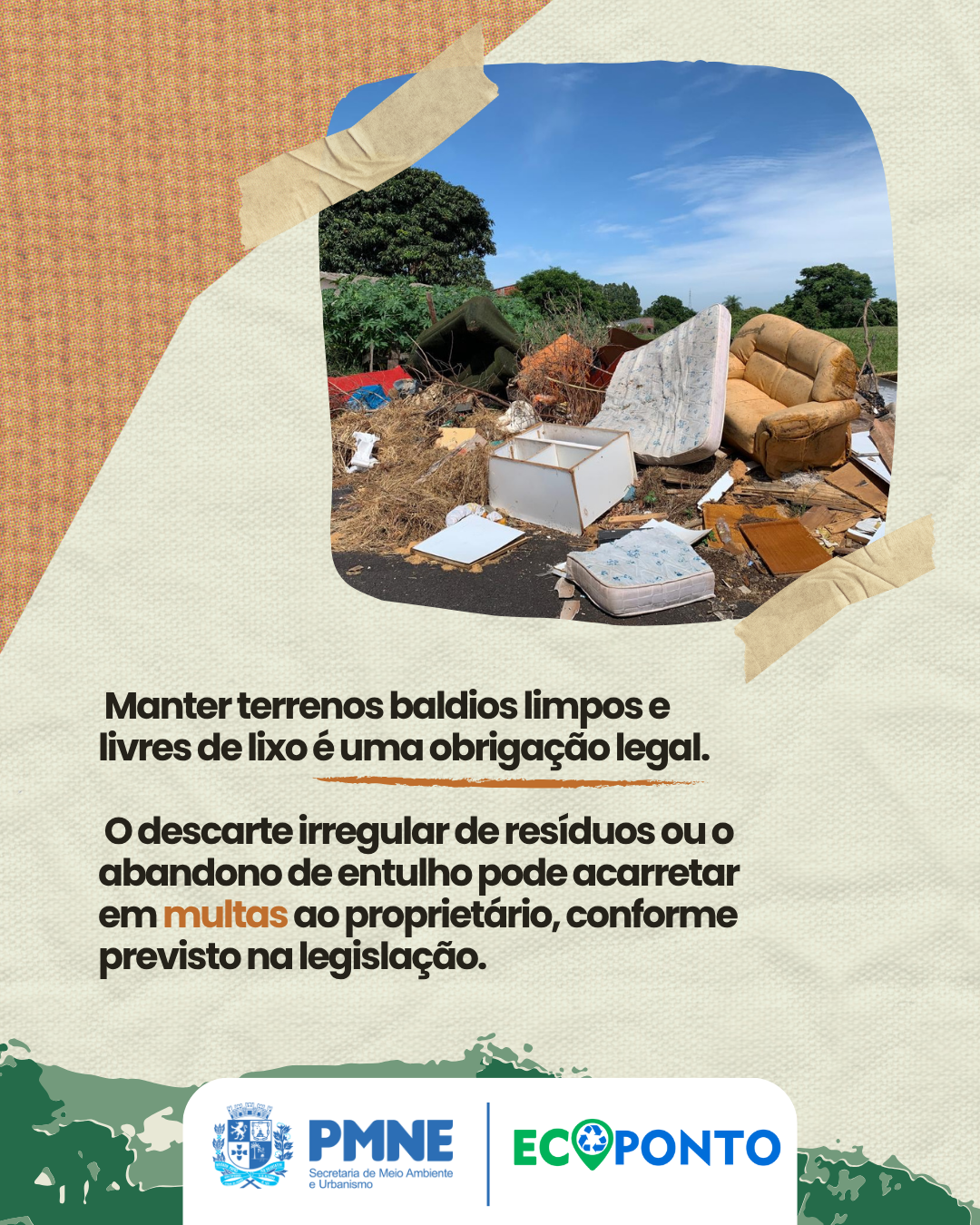 A Prefeitura Municipal de Nova Esperança, por meio da Secretaria de Meio Ambiente e Urbanismo, reforça a importância do descarte correto de resíduos e a manutenção de terrenos limpos — ações fundamentais para garantir uma cidade mais saudável, segura e livre de focos de doenças.