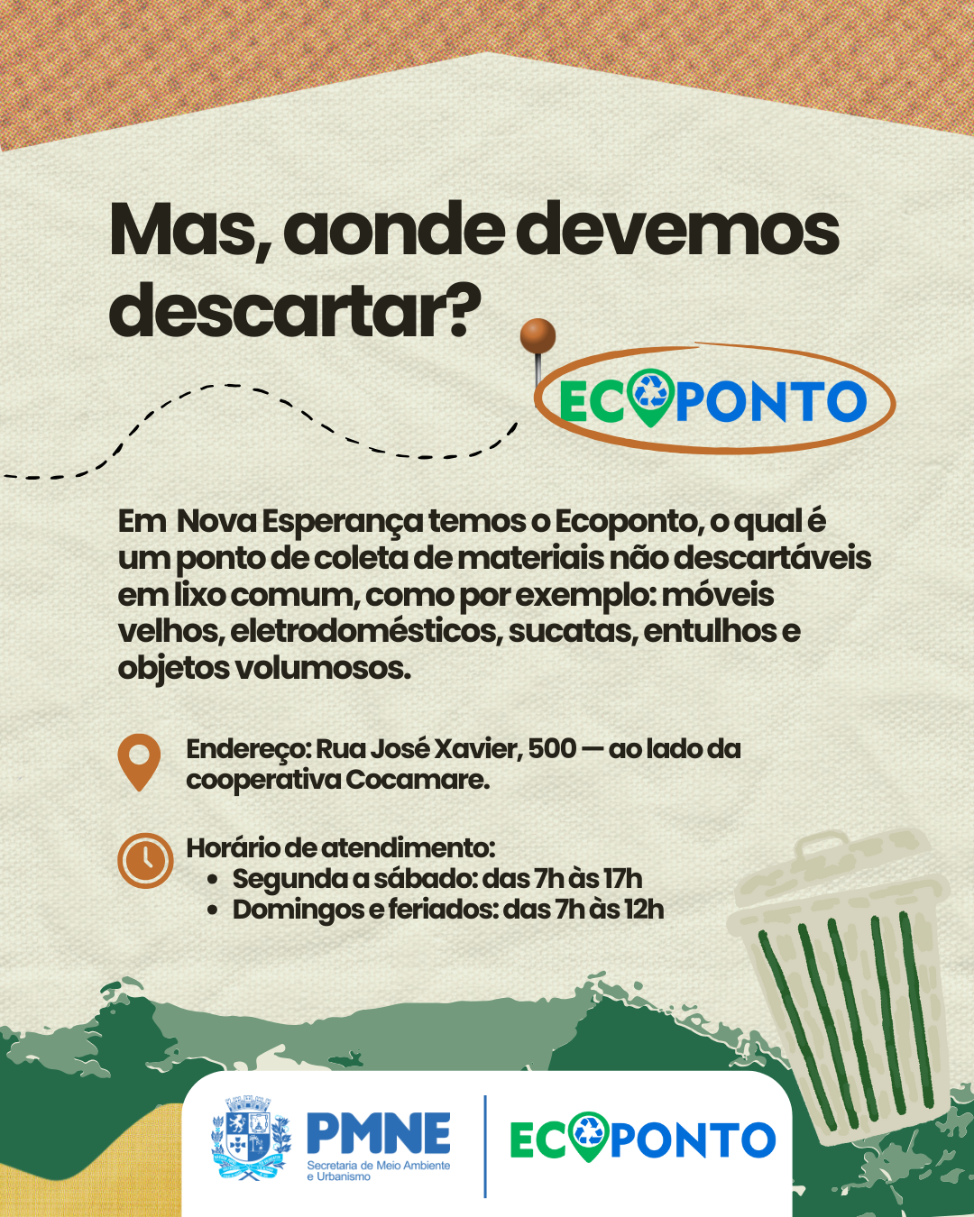 Para facilitar o descarte adequado de materiais que não devem ser colocados no lixo comum, o município conta com o Ecoponto de Nova Esperança — um espaço destinado à coleta de resíduos de grande volume, como: